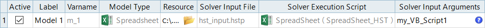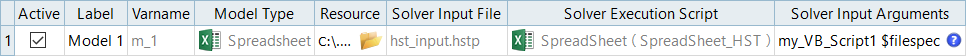 This example illustrates a Spreadsheet model type with solver input arguments for an Excel connection.