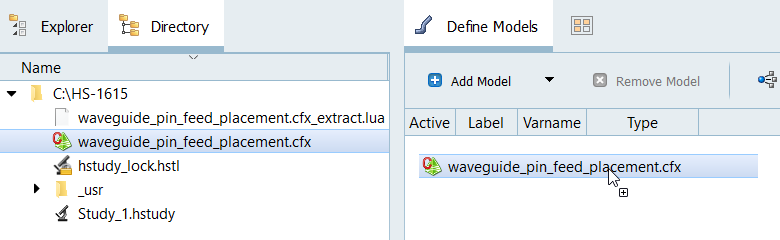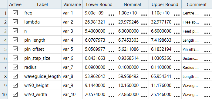 Ten input variables are imported from the waveguide_pin_feed_placement.cfx file.