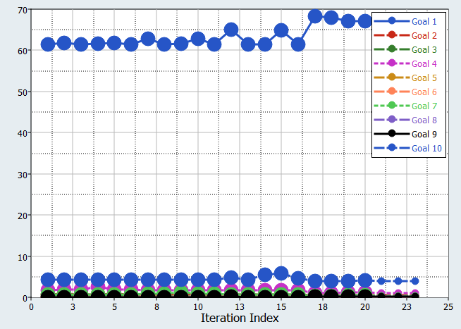 - During the execution of the DOE, you can monitor the evaluation of the 16 runs in either the Evolution Plot or Evolution Data tabs.