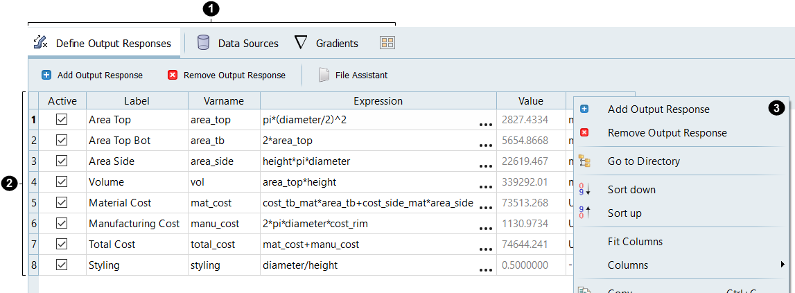 - Additional options are included in the work area context menu, such as options to sort column data, cut, copy, and paste data into columns, fit table columns, or turn the display of columns on/off.