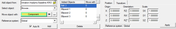 The objects that are added to the current model are listed in the Add Objects list. The component with which the object will move is selected from the input collector or Choose From List dialog and is then added to the Move with column next to the corresponding object.
