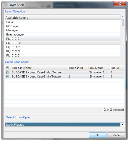 Use the Layer Book tool to contour required results, select layers and load cases, and choose an export option.