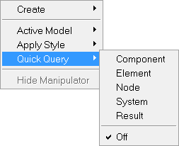Once an option is selected, the Quick Query mode will remain active for the selected entity until the option is turned off. You can click the left mouse button to query nodes, elements, components, or systems in the model. The information that is displayed will depend on the type of entity selected.