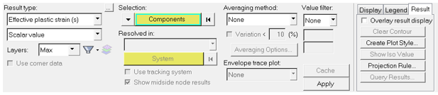 - Select from the various options available for: result type, element layer, entity selection, resolved in (result coordinate system), show midside node results, averaging method, averaging options, and envelope trace plot.