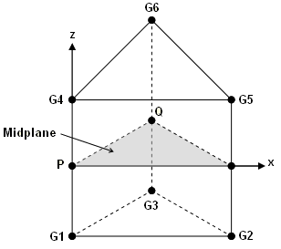 - z = A line along the bisector of the midplane normal and the line connecting the centroids of the top (G1-G2-G3) and bottom (G4-G5-G6) faces.
