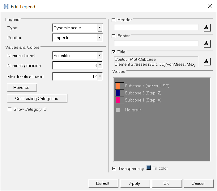 legend is 2; the maximum is 32. The default setting is 12, however you can set this value to adjust the color bands in the graphics area to provide one color band per category (to the extent feasible) as the loadcases are switched or transient results are viewed. Once the max level is exceeded and there are more contributing categories for a plot, the grouping of the categories will take place automatically. If the number of contributing categories are less than the max levels allowed for any given plot, then only the few color bands pertaining to each contributing category will be displayed. The grouping
