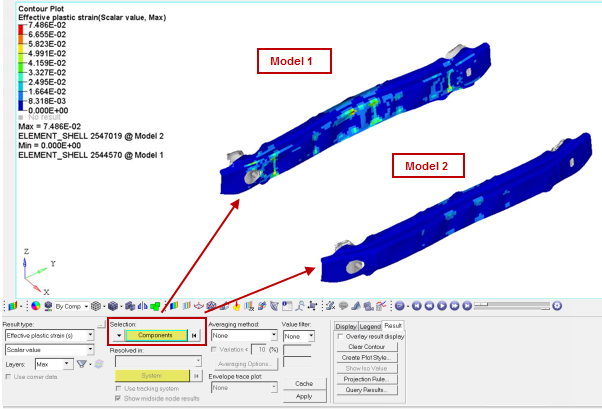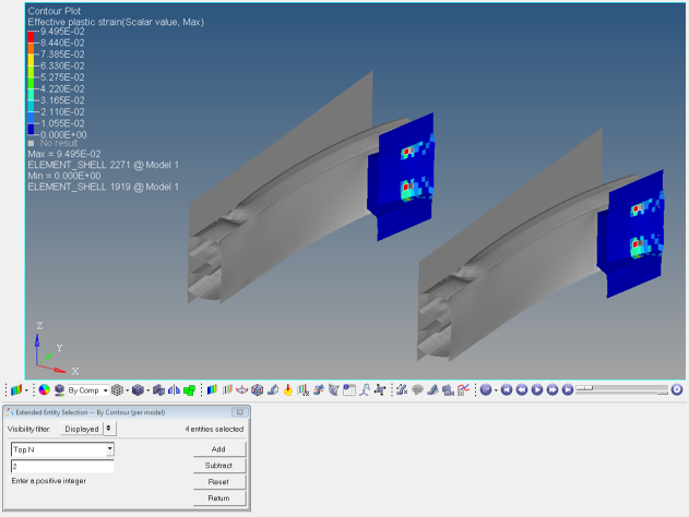 For overlaid models, this selection method will work on a per model basis. For example, if you want to select elements using the Extended Entity Selection -- By Contour method and you search for Top N with N=2, HyperView will select four entities (two entities for each model).