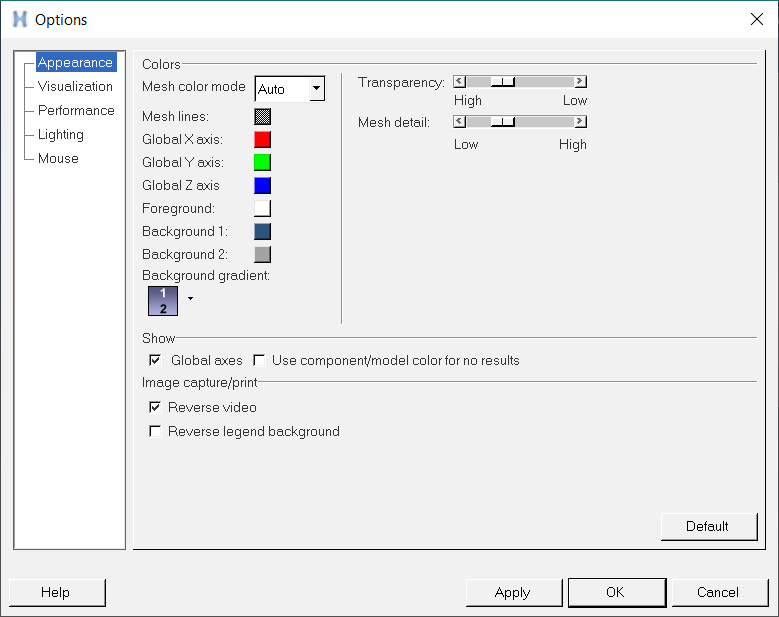 | Mesh color mode | The mesh color mode is set to Auto, which uses the component color as the basis of the mesh line color. This option can be changed to a custom mesh line color using the Override option, which will use the selected custom mesh line color for the entire mesh. | |