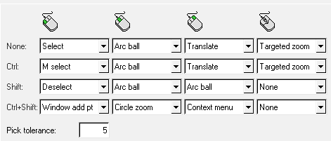 On the left side of the dialog box, None, Ctrl, Shift, and Ctrl + Shift are listed. If you select a function from the drop-down menu next to None, that function is enabled when you press the mouse button. If you select a function from the drop-down menu next to Ctrl, that function is enabled when you press the mouse button and the Ctrl key on the keyboard. Similarly, when you select a function from the drop-down menus next to Shift or Ctrl + Shift, those functions are enabled when you press the mouse button and the Shift key or the mouse button and the Ctrl + Shift keys simultaneously.