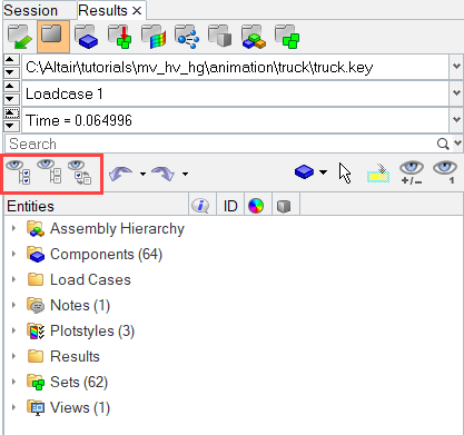 The Results Browser resides on a tab in a tab area sidebar and allows you to view the HyperView model structure while providing find, display, and editing control of entities.