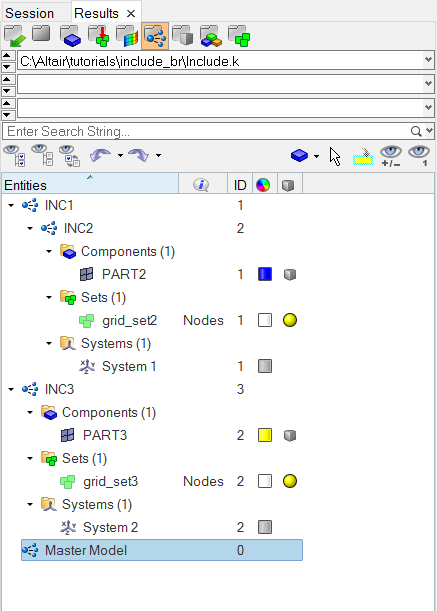 Includes are read from a model input deck, and as such, no further organization is allowed in HyperView. Components, assemblies, sets, and systems are the only supported entities. Unlike HyperMesh, entities cannot be moved from one include to another.