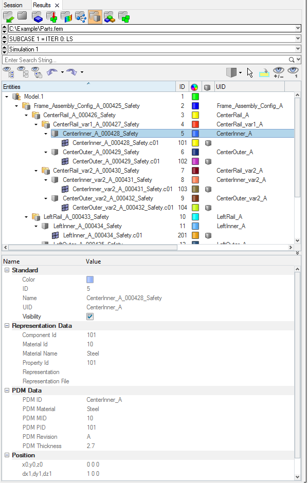 - Displays PDM attributes that were parsed as metadata during the BOM importation, such as PDM ID and PDM Revision. This information is used to generate the initial component, property, and material cards upon creation of the common representation. These attributes can be used to cross-reference common and discipline specific mesh representation attributes.