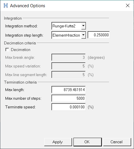 The Advanced Options dialog allows you to customize a number of parameters which control how the streamlines are generated.
