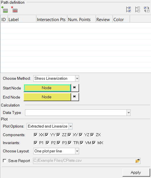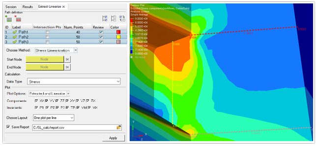 - Stress linearization calculations are performed at the simulation step at which the Apply button is clicked. Therefore even if the path was defined in another step, when applied, the line is updated per the location of the start and end nodes at the current step.