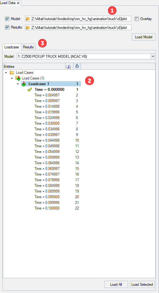 - Load Model and Results: Choose the model and result file to load into the HyperView window.