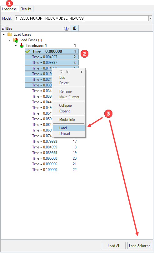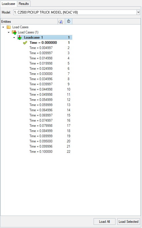 Once the model/results are loaded, the Loadcase tab automatically populates to show the available steps in the file.