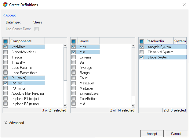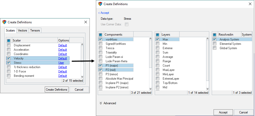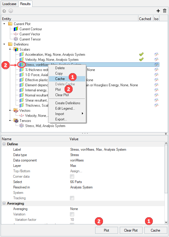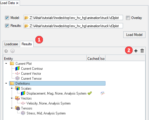 - Results Tab: Choose the results to load for contour/vector/tensor/iso plotting by creating result definitions.