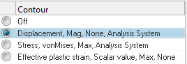 - Current Plot: Use current contour, vector or tensor results to plot data. This is an 'on-demand' approach to plotting. If you want to change the plot to a different result, use the Entity Editor section to modify the definition. In this approach, data remains in memory as long as the plot is displayed. Once you clear the plot or edit the definition to view a different result, data is again read from the file.