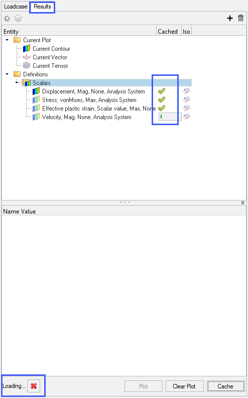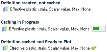 In the Upfront Data Loading profile, result definitions are cached only for the animation steps that have been loaded in the Loadcase tab. If additional steps/frames are loaded at a later stage, the cached (but not plotted) definitions are not automatically updated. You will see the green check mark on the cached definitions turning into a partially loaded progress bar, indicating that the data is not available for the additional steps. Also, if you plot a cached definition and animate, you will see an N/A plot on the additional frames. To get the data for the additional steps, simply cache the definition again.