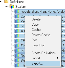The preference statement, *DefaultResultDefinitionFile, defined in the preferences_post.mvw file, allows you to point to an XML file containing definitions, thus saving the time required to manually create the definitions each time. Every time a model is loaded into the session, the definitions contained in the file are automatically created and shown in the Results Tab.Tip: HyperView only checks if the data type and component necessary to create the definition are available in the file. You are therefore expected to set this option only when you load files containing all the relevant data required to create the definitions.