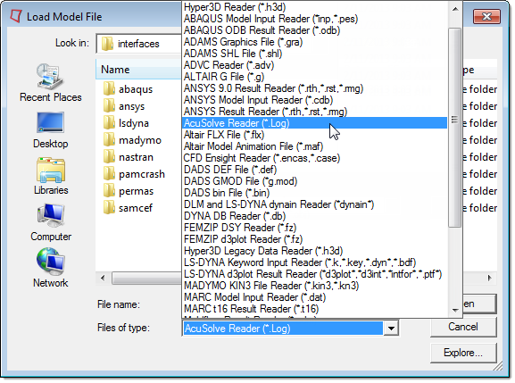 The AcuSolve reader can be explicitly selected by clicking on the Files of type: pull-down menu and selecting AcuSolve Reader (*.Log). Once the AcuSolve reader has been selected, only the AcuSolve *.log files will be displayed in the directory.
