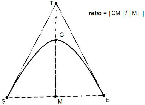 - Parameter that defines the created conic curve segment "altitude". Consider the segment that connects the tangents’ intersection point with the midpoint between the start and end points of the curve. If the length of this segment is used as the unit length, then the ratio is defined as the length of the portion of the segment that connects the midpoint with the point where the segment is intersected by created curve (see figure below). Valid values for ratio are in the range 0 to 1. For the value of 0.5, the conic curve is a parabolic segment. For the values between 0 and 0.5, the conic curve is an ellipse. For the values between 0.5 and 1, the conic curve is a hyperbolic segment.