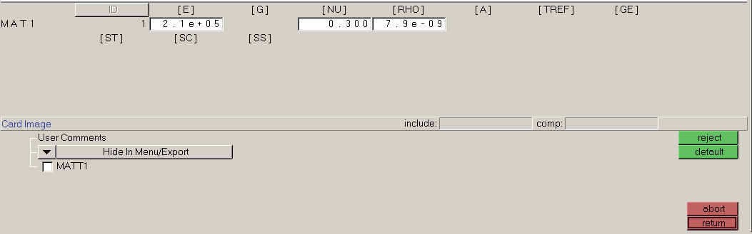 The HyperMesh Card Image panel is used to define solver specific data and review card information. The format of the cards and the menus in the panel are defined in the export template, using HyperMesh Card Preview Commands.