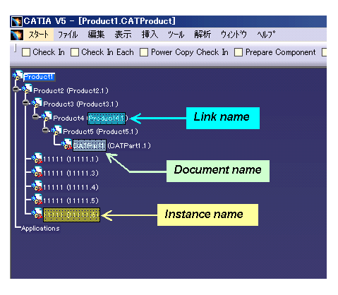 The instance name of the document combines the document’s own name (independent on the assembly that it is contained in) and the link name that is used to reference this document in the assembly.