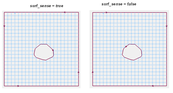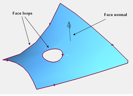 If the value of the parameter surf_sense is false then the face normal is reversed with respect to geometric surface normal and all loops have the face on their right in parametric space. The external loop of the face in this case is oriented clockwise while all internal loops are oriented counter clockwise.