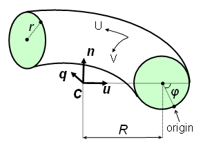 S(U, V) = C + r n sin(V-φ) + [ R + r cos(V-φ) ] [ u cos U + q sin U ]