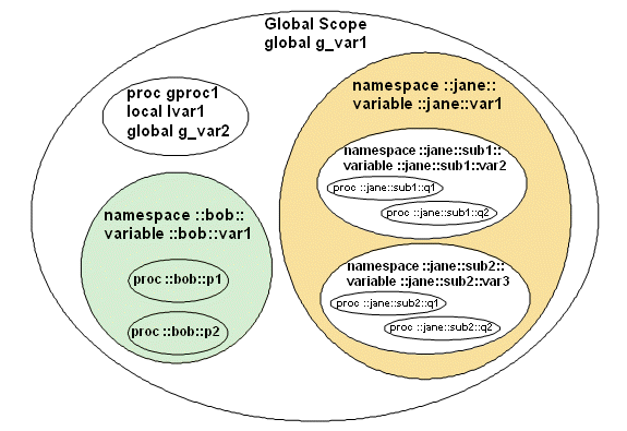 A global procedure acts just like any function within Tcl. A global procedure can be called from a namespace without any need to import or otherwise localize the procedure. A procedure within a namespace is local to the namespace unless it is explicitly called or the procedure is exported from the namespace. The global scope is also designed such that any variables defined outside of a procedure or a namespace are automatically in the global scope. To access a global variable in a local scope, such as a procedure or namespace, you will need to use the global command. As a script grows and as the number of scripts running simultaneously increases, the ability of the developer to avoid conflict between the names of procedures and variables defined in the global scope decreases.