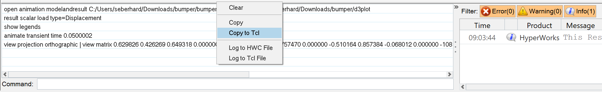 All HWC commands from the command history can be copied in the Tcl syntax to the clipboard using the Copy to Tcl option in the context menu of the HWC console:
