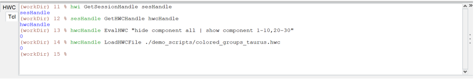 <hwc_handle> EvalHWC <hwc_commands>The <hwc_command> can consists of one or multiple commands separated by the pipe symbol, "|". If you copy multiple commands in the command line, the pipe symbol, "|", is automatically inserted.