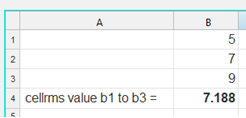 =cellrms("range", B3,B8,C12,D14)=cellrms("list", B3,B8,C14)Calculating the rms value from cell ranges B1 - B3: