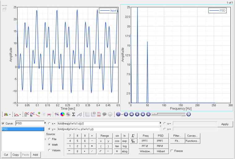 The fold function is used with x and y to display the one-sided spectrum above.