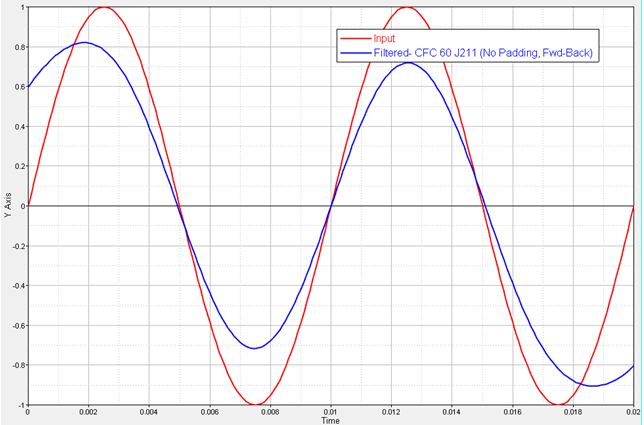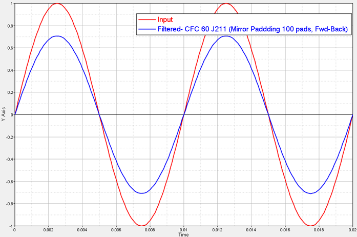 The filtered data has reduced amplitude because of the filter attenuation. Without padding, the filtered data does not track the signal at the beginning of the curve well. This is the result of the filter lag. There is also lag at the end of the curve if filtering in both directions. The purpose of padding is to attempt to minimize the lag by creating an assumed signal history and future beyond the data collection window. This can often allow the filter to acquire a more meaningful initial state than the default when the collected data enters the filter.