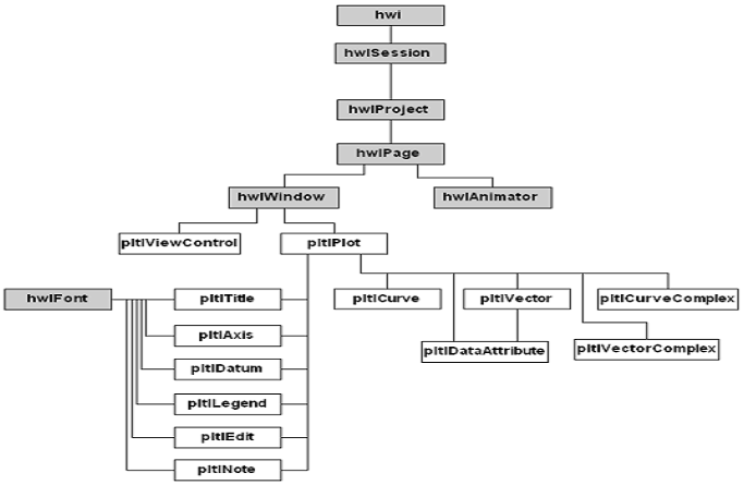 Figure 2. Class Hierarchy of Handles in HyperWorks. APIs are not shown in this chart.For example, to use the AddPage API on a hwIProject handle, you must open the session handle followed by the project handle.- When each handle is opened, a name is given to the handle for