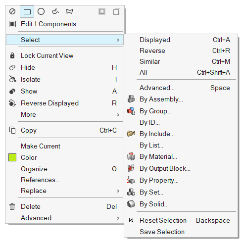 - Cascading menu organized solver entity list.