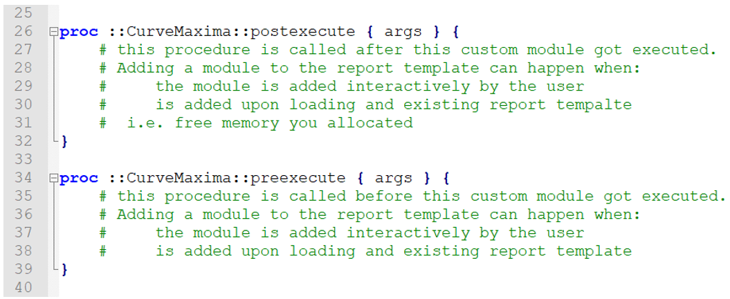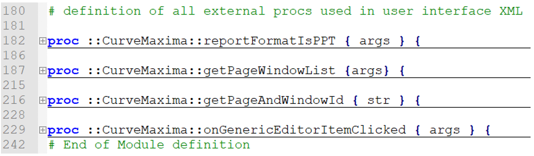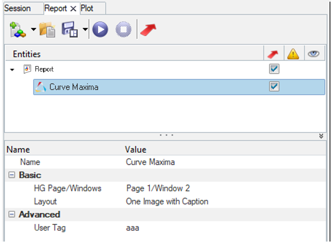 You can edit the template CurveMaxima.xml to change the hierarchy in the property area. It can also be edited to change the selection styles from combo box to multi-selector. Basic functions, such as getting default pages and window IDs, and special instructions regarding when the Report is in Presentation or Document mode, can be written in the Tcl script and referred to in the XML file.