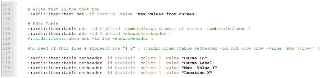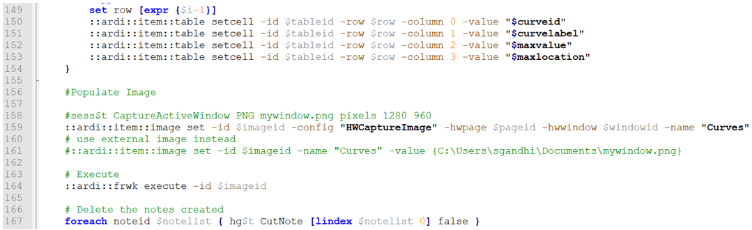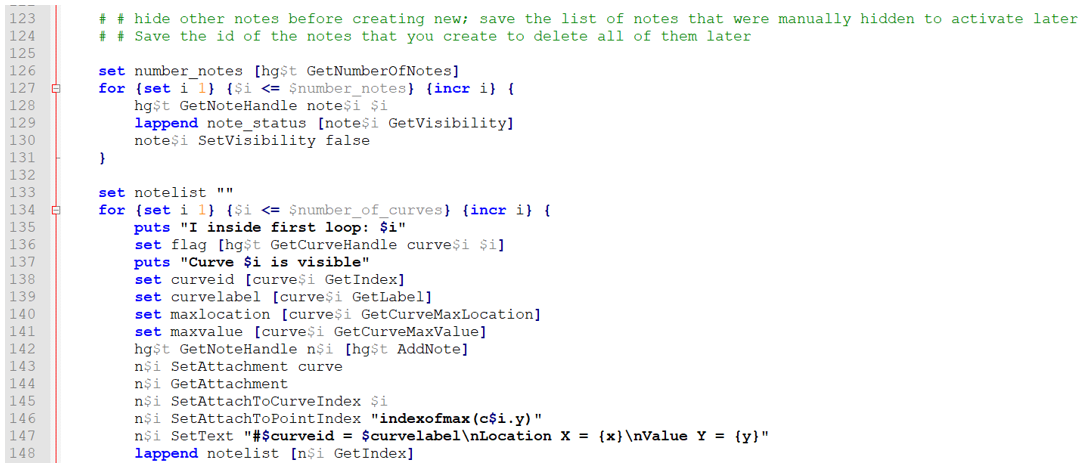 A set of lines (Tcl) that prepares the data is required. For this module's objective, the HyperGraph window needs to be defined to get a clean capture. This includes all curves visible and only the maximum value notes created. Also, the values of the maximum Y and its equivalent X need to be found for each curve ID and label.