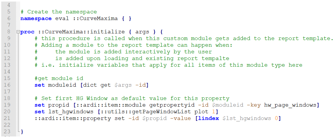 In the Tcl script, the initialize block receives the ID and the position to be assigned to the module. Also, it takes the values set in the property area of the module in the user interface.
