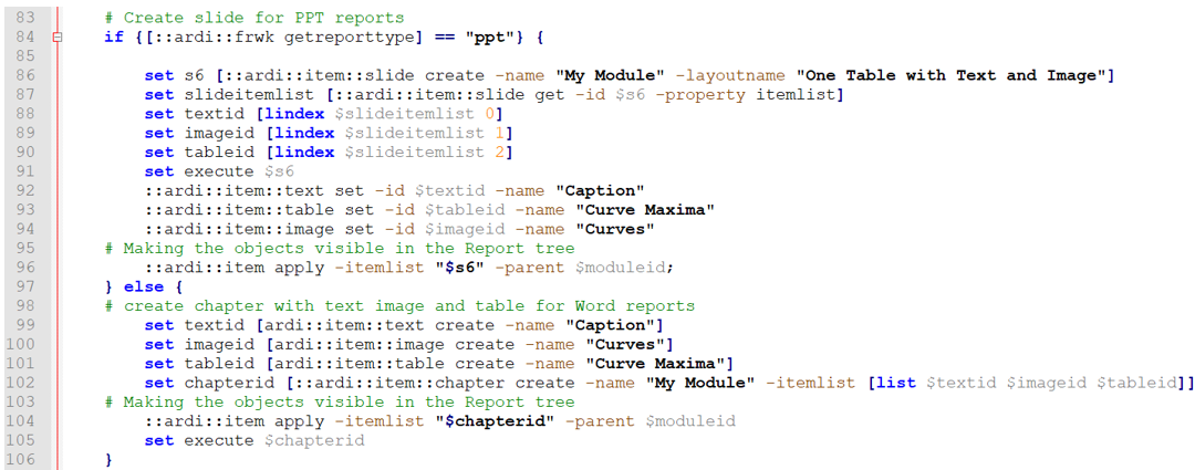 The Report API layer is used to create slides based on slide layouts or Document chapters. These objects contain images, text, and tables.