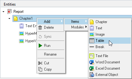 Right-click at the Report or Chapter level and select Add > Items > Table. Figure 1.