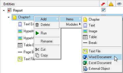 - If the external Word document contains a Table of Contents, Table of Figures, or Table of Tables, these sections are not copied from the external Word document to the current report.