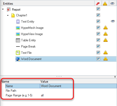 - By default, the Page Range value is all. All pages from the external Word document are added to the report.