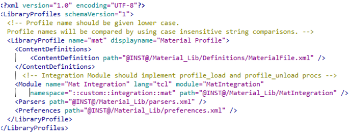 A typical profile consists of the following: Install.tcl: To install the profile, libraryprofiles.xml: Contains path to Content definitions, parsers and custom integration .tcl files, and Main folder: Contains custom scripts, content definition .xml files and parser .tcl files.
