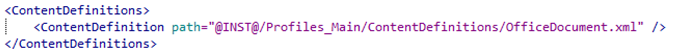 Now you will create content definition for office documents. The folder \Profile_Main\ContentDefinitions contains all the content definition files of a profile. Since you are creating only one content definition for this profile the start package has only one content .xml file. A profile can have multiple content definitions.