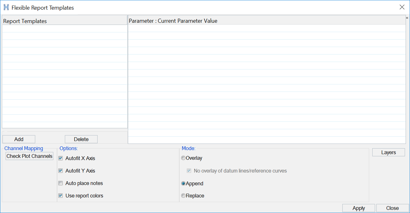 If you delete a curve or make other changes within the Flexible Report Templates dialog, such as adding another layer, click Refresh to reflect those changes inside the Layers dialog.