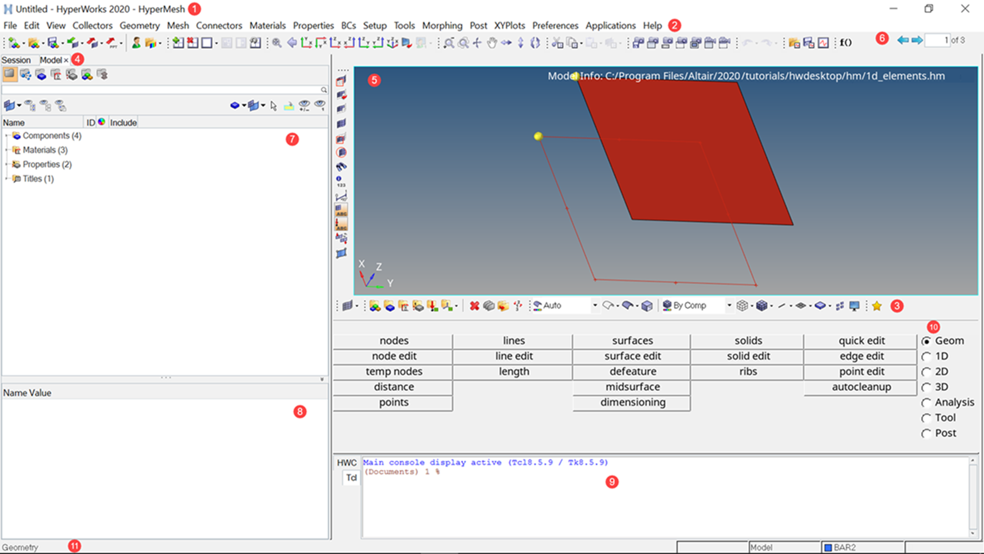 - Modeling Window. Displays your model, geometry, and plots, and allows you to select entities and manipulate the view of the model in the modeling window.