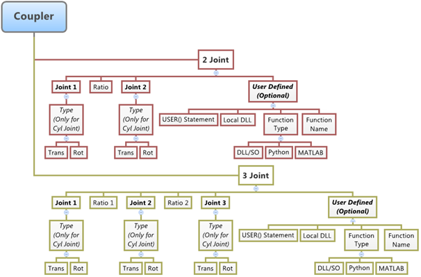 This constraint element may be used to model idealized spur gears, rack and pinion gears, and differentials as simple constraints that relate the displacements in a set of joints. Couplers can be used to specify relationships between translational, rotational, and cylindrical joints only.